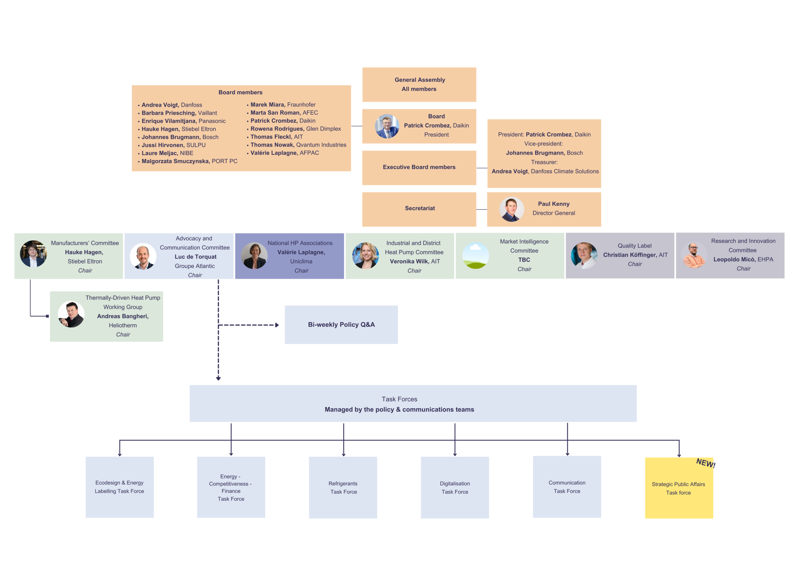 An elected board coordinates EHPA’s activities. It is supported by committees which are established by the annual General Assembly on specific topics.